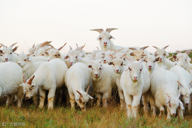 东经 105°、北纬 40°,在北半球的鄂尔多斯大草原上,生活着另一种重要的羊种。它们的长相跟美丽诺绵羊截然不同。它们的被毛不那么卷曲蓬松,身材也没有那么庞大。它们的毛像婴儿的头发般又细又软,粉色的耳朵两边,还长着一对小小的犄角。