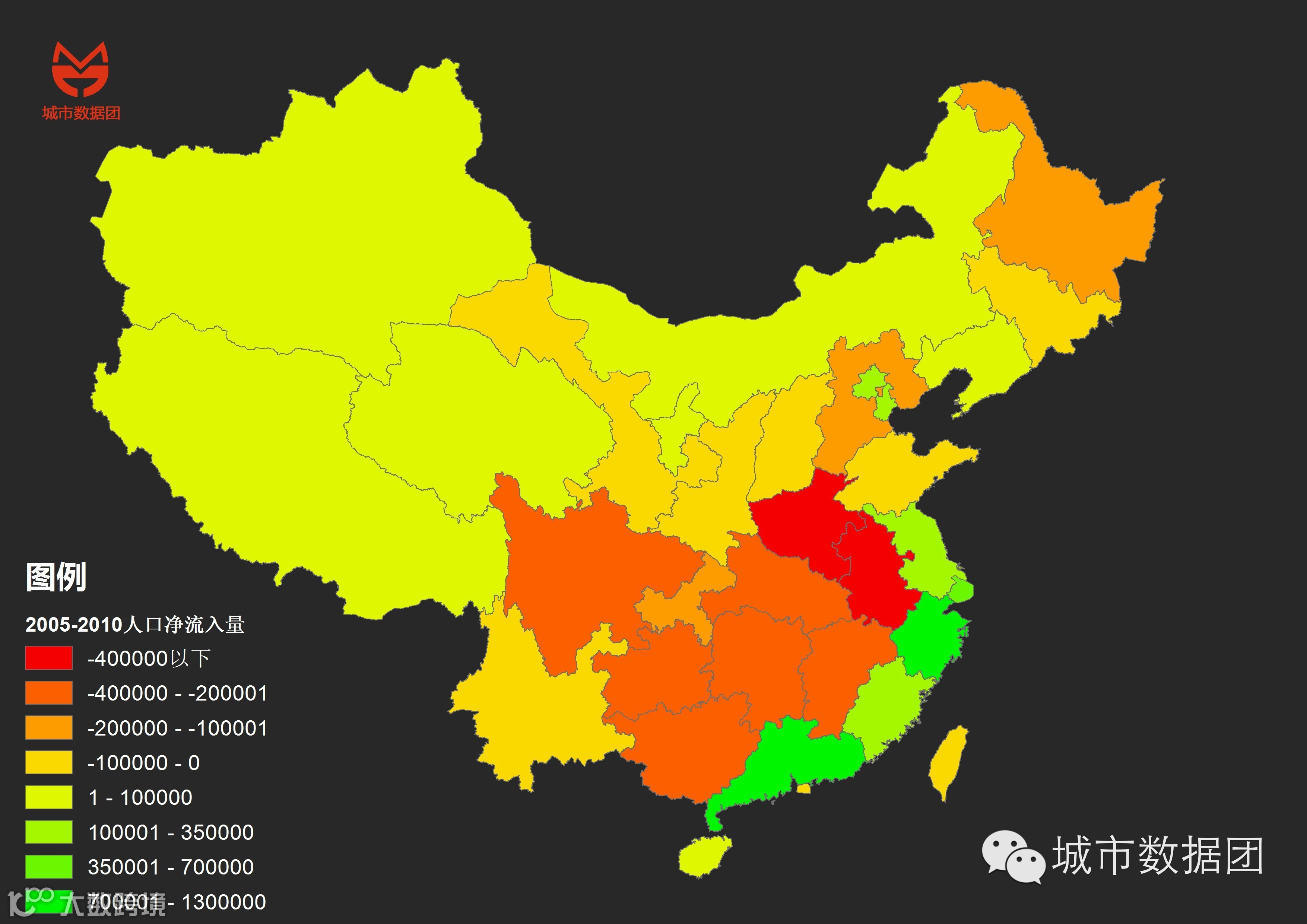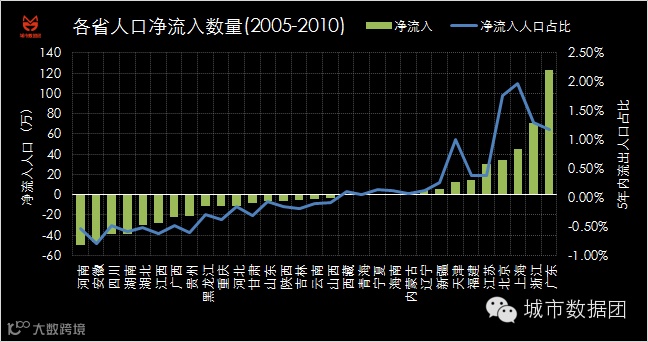 从上图中可以清楚地看到,大半个中国的人口,以省为单位来观察的话,全都在净流出,而少数净流入的地区,则集中分布在东南沿海和北京天津两地。