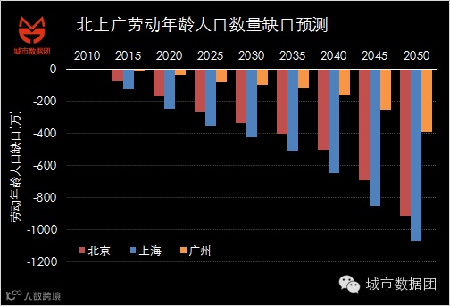 第三步,计算“北上广”至2050年的劳动年龄人口缺口。我们假设这三个一线城市从2010年至2050年都不再有移民进入,那么其劳动力的缺口如下图所示: