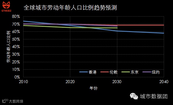 横向对比一下,即使是全球一线城市,伦敦纽约东京,他们的人口年龄结构预期也不过就是在这个区间而已。如下图所示: