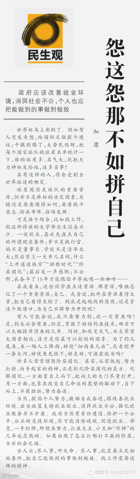 一说就业,有人喜欢先盘点自己的条件:爹不是执行官、妈不是董事长、学校不是清华北大……盘点这、盘点那,唯独忘记了重要资源:自己。或者说,把外在资源看得太重,把自己看得太轻了。的确,政府应改善就业环境,消弭社会不公,个人也要把自己能做到的事做到极致。