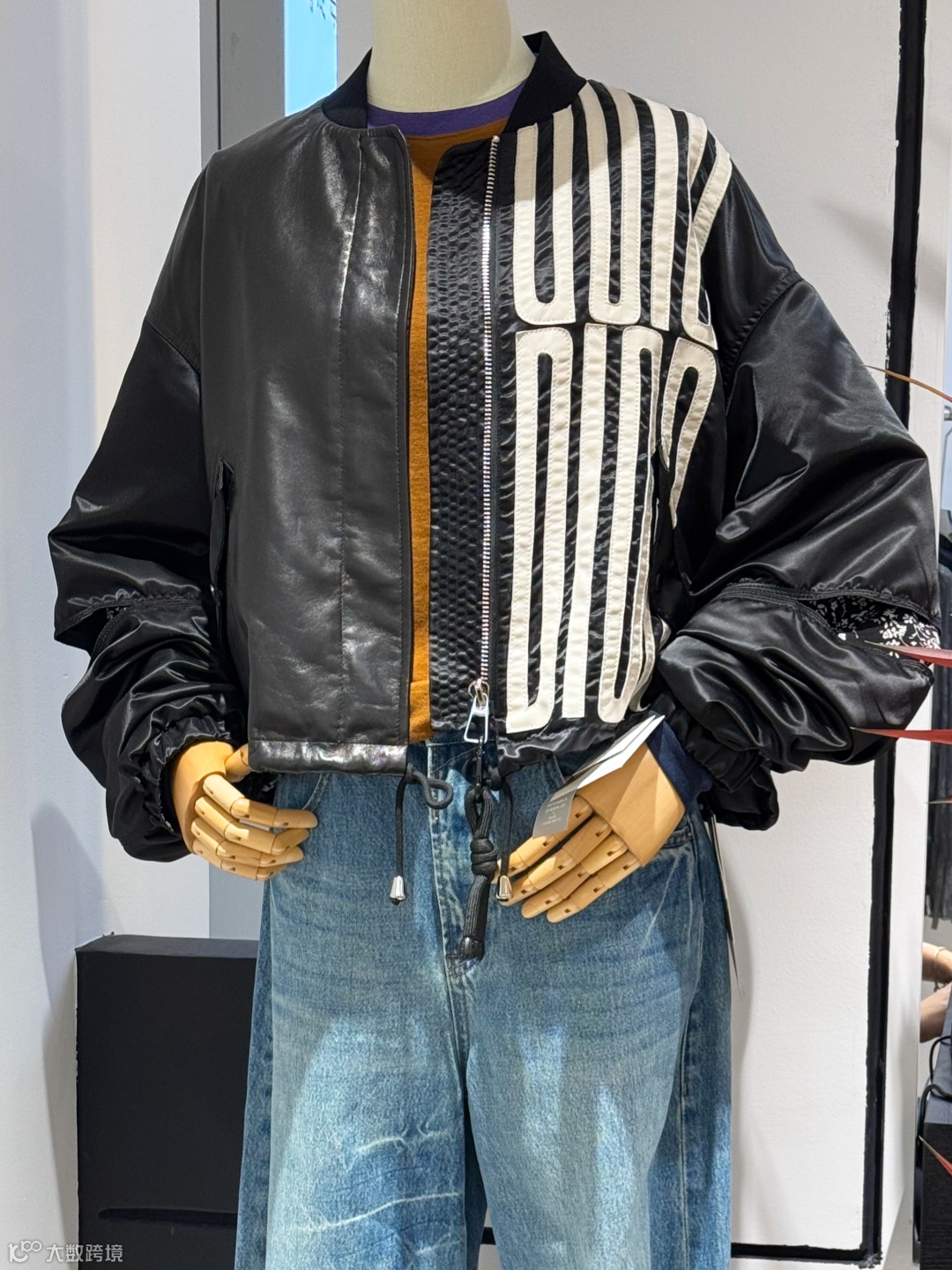 黑色拼接棒球领皮衣:棒球领设计复古利落,皮革与亮面面料拼接很有层次感~