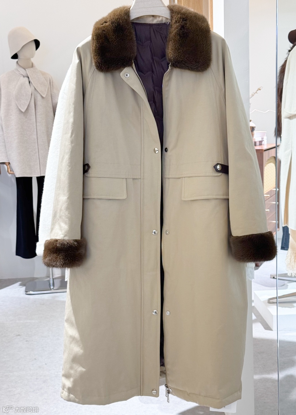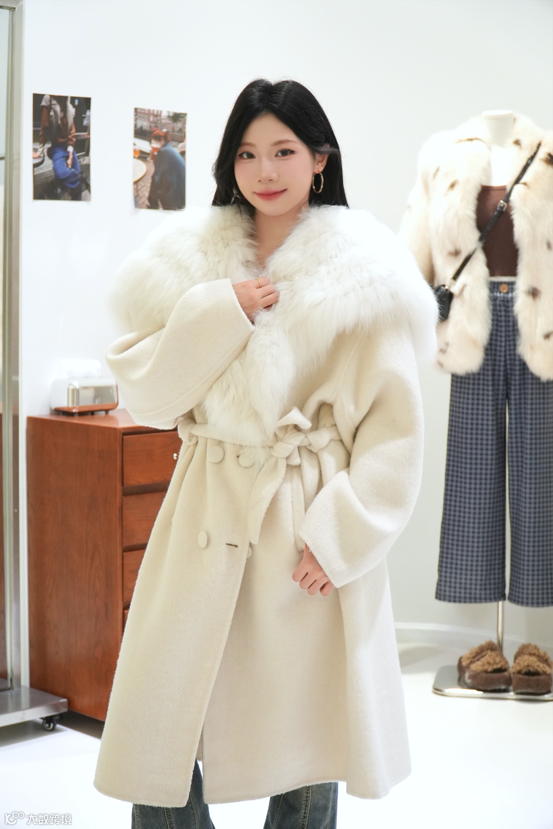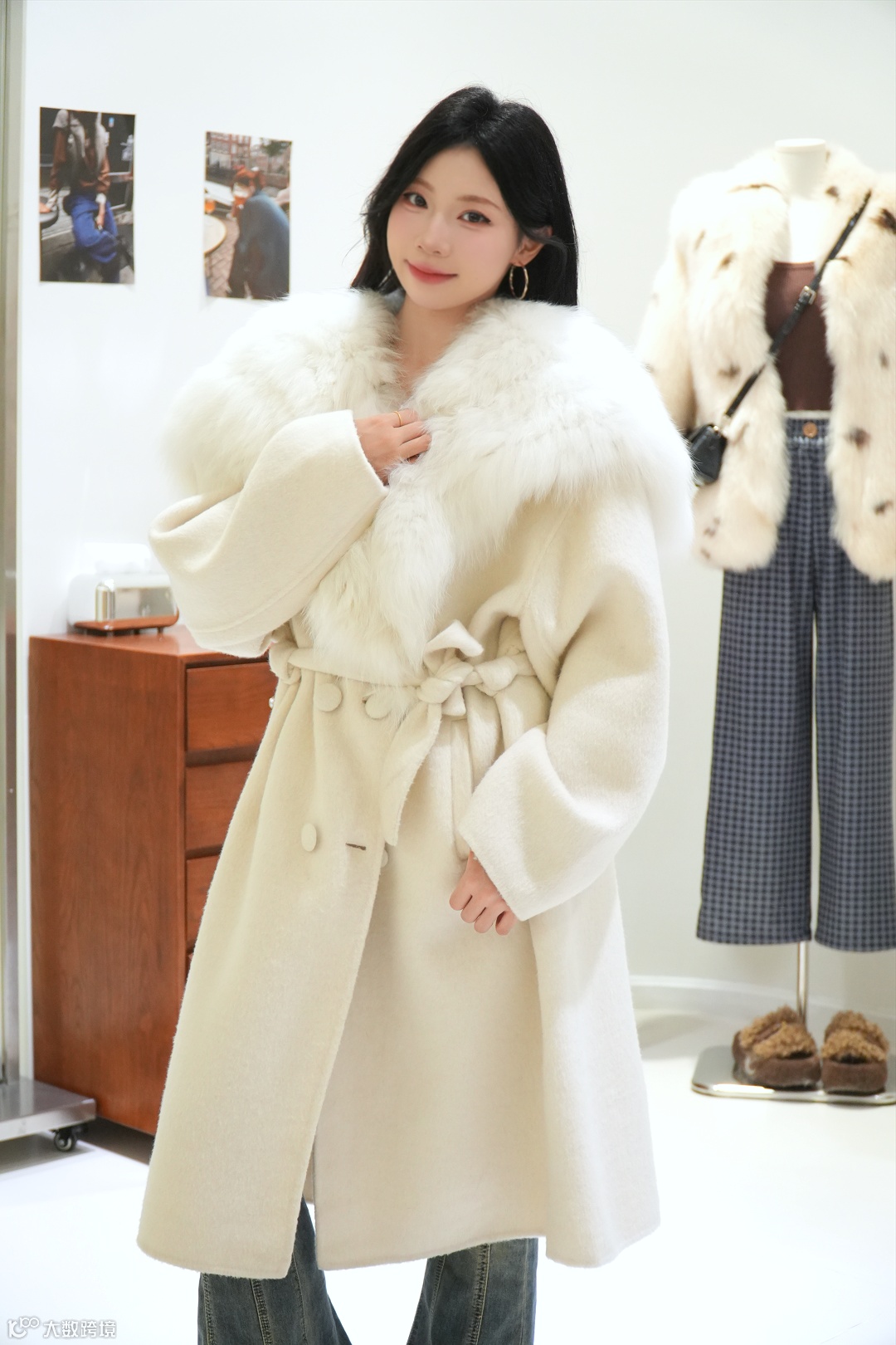 米白色狐狸毛领羊绒大衣,腰带收腰显身材,大毛领奢华又温暖,秋冬通勤穿它高级感爆棚~