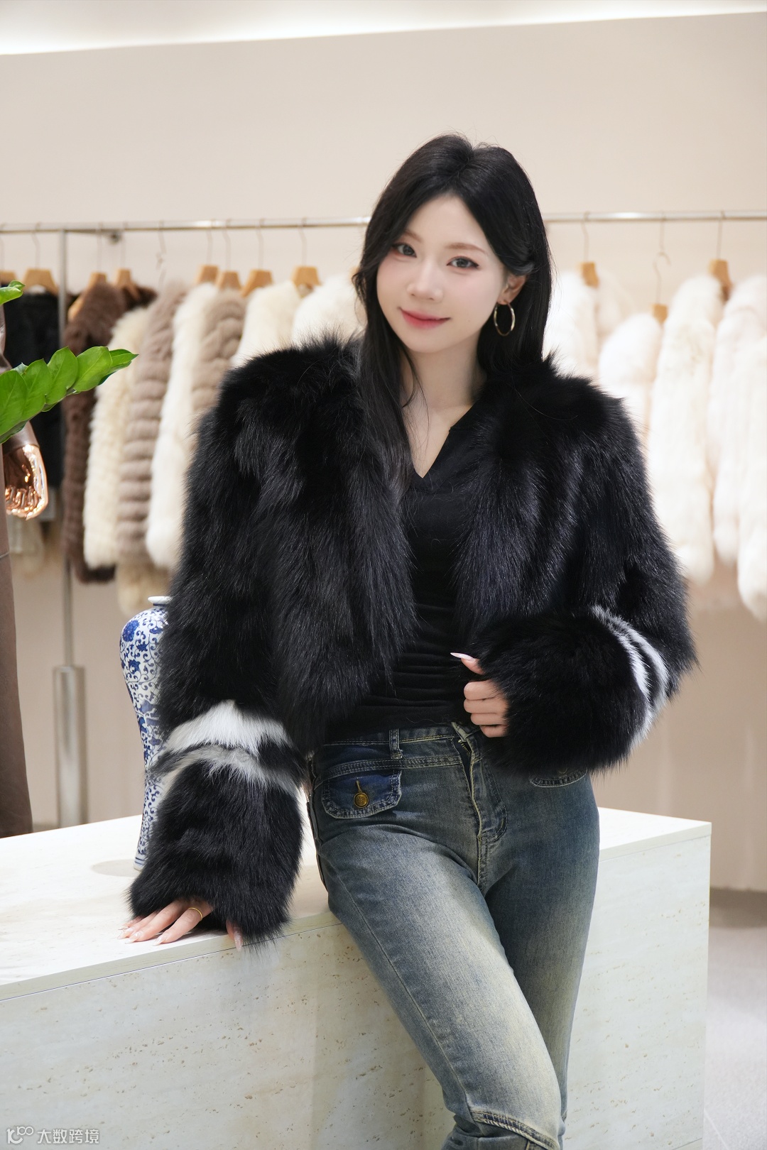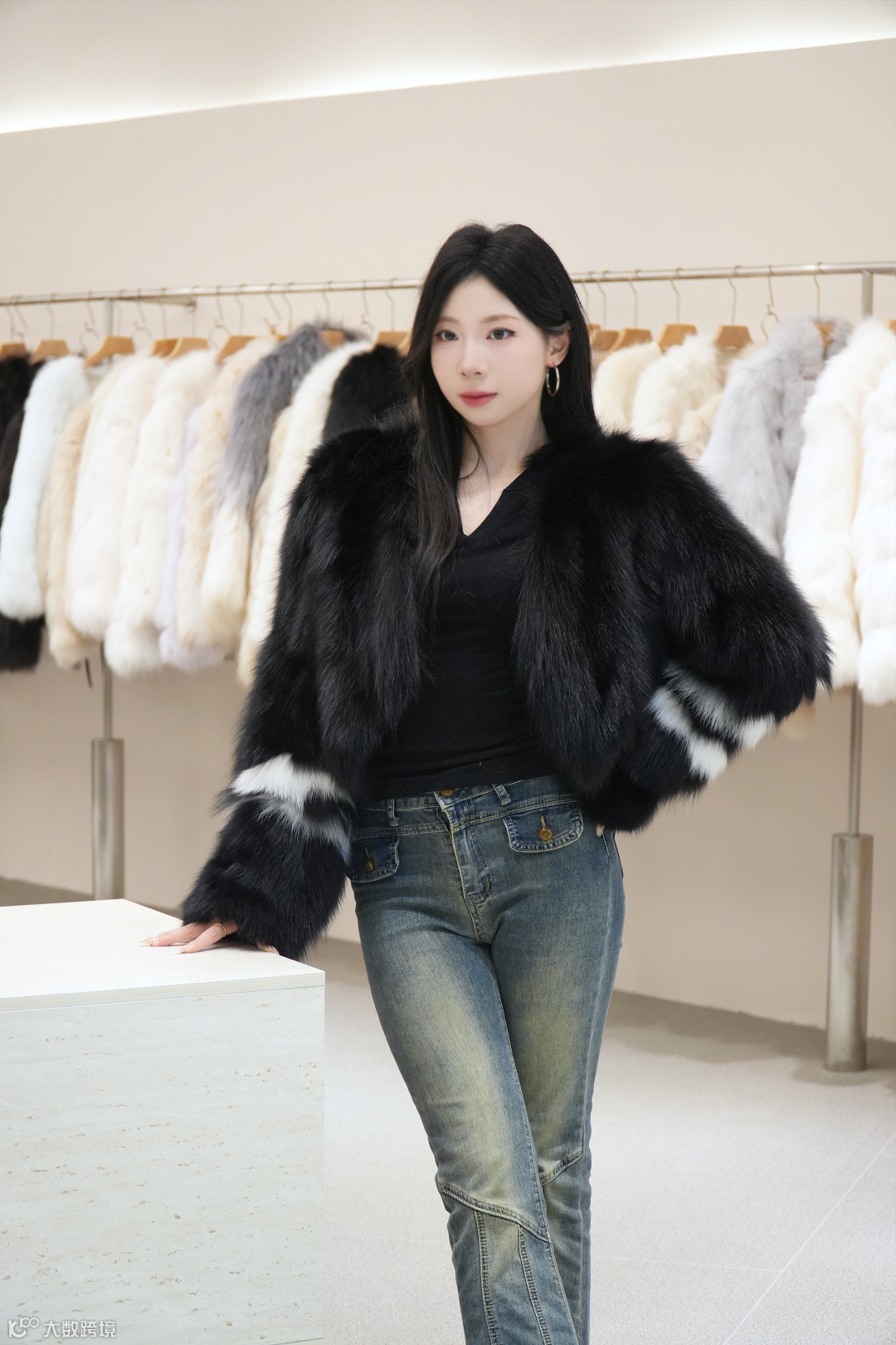 黑白撞色狐狸毛皮草短款,设计感拉满超吸睛,配黑上衣牛仔裤,秒变时髦酷 girl~