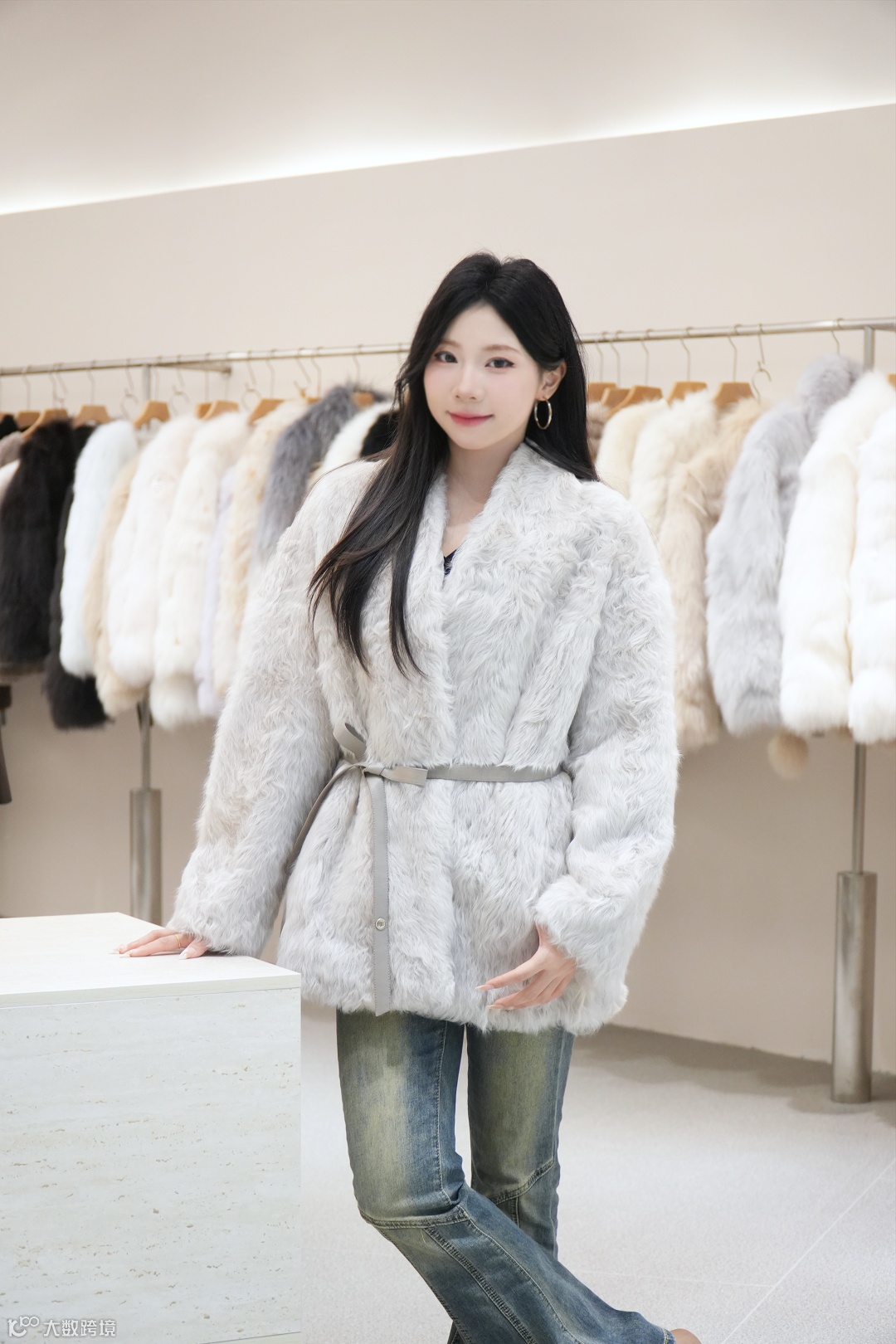 浅灰色收腰托卡,毛绒软糯质感绝,腰带一系显腰细,搭牛仔裤轻松穿出高级感~