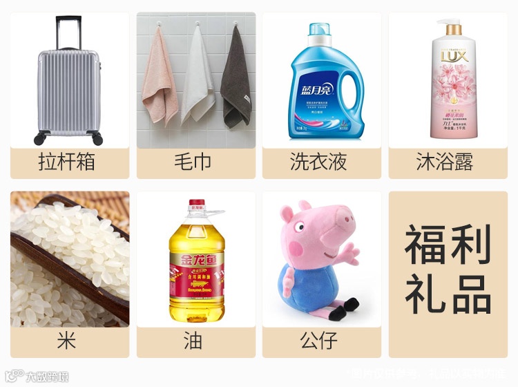 拉杆箱、米、油、沐浴露、洗衣液、玩具公仔、毛巾