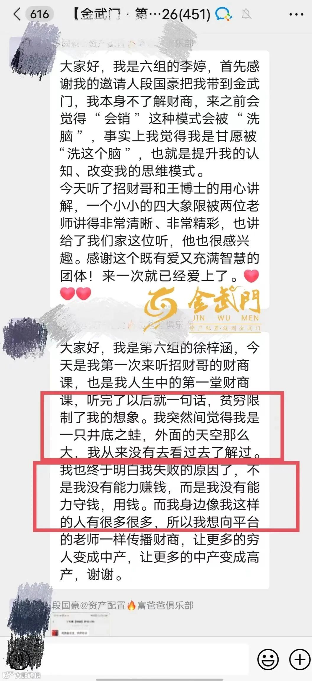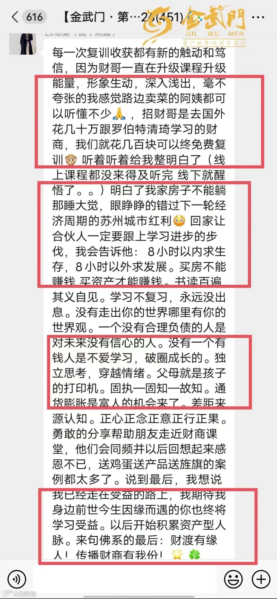 穷人与富人的重要区别:富人最后才买奢侈品,而穷人和中产阶级会先买下诸如大房子、珠宝、皮衣、宝石、游艇等奢侈品,因为他们想让自己看上去很富有。真正的奢侈品是对投资和积累真正资产的奖励。——资产倍增落地引领者+华东区财商教育第一品牌~金武门集团,于12月23-24日合肥隆重召开第11期《财富真相》研讨会,三天两夜,让您少奋斗十年!不学财商•必定财伤!名额有限、报名从速…
