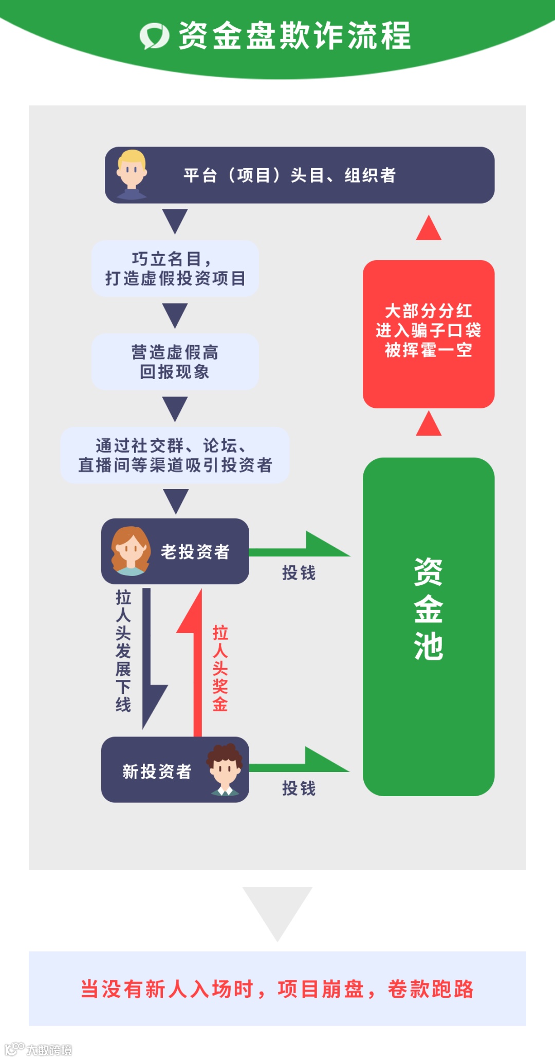 资金盘诈骗从一开始就以非法占有为目的,玩的是击鼓传花的游戏,当骗局持续到一定阶段,平台(项目)头目或者组织者通常会采取停止交易、关闭项目等方式来进行跑路敛财。