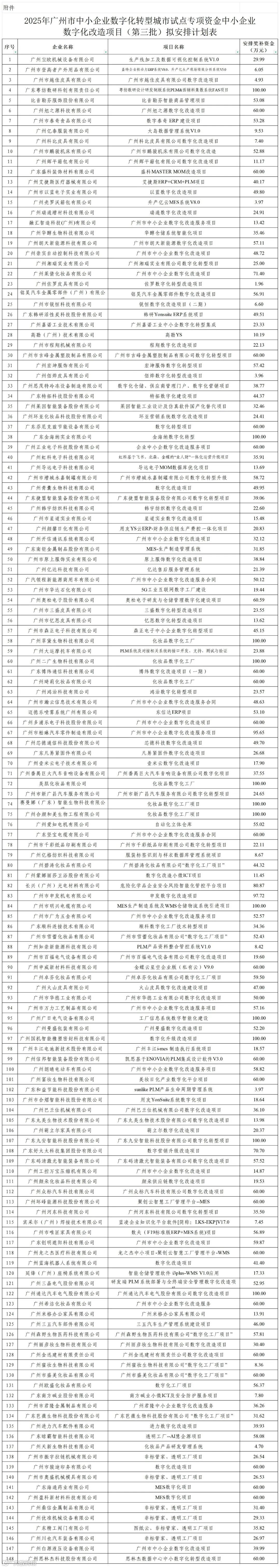 附件:2025年广州市中小企业数字化转型城市试点专项资金中小企业数字化改造项目(第三批)拟安排计划表