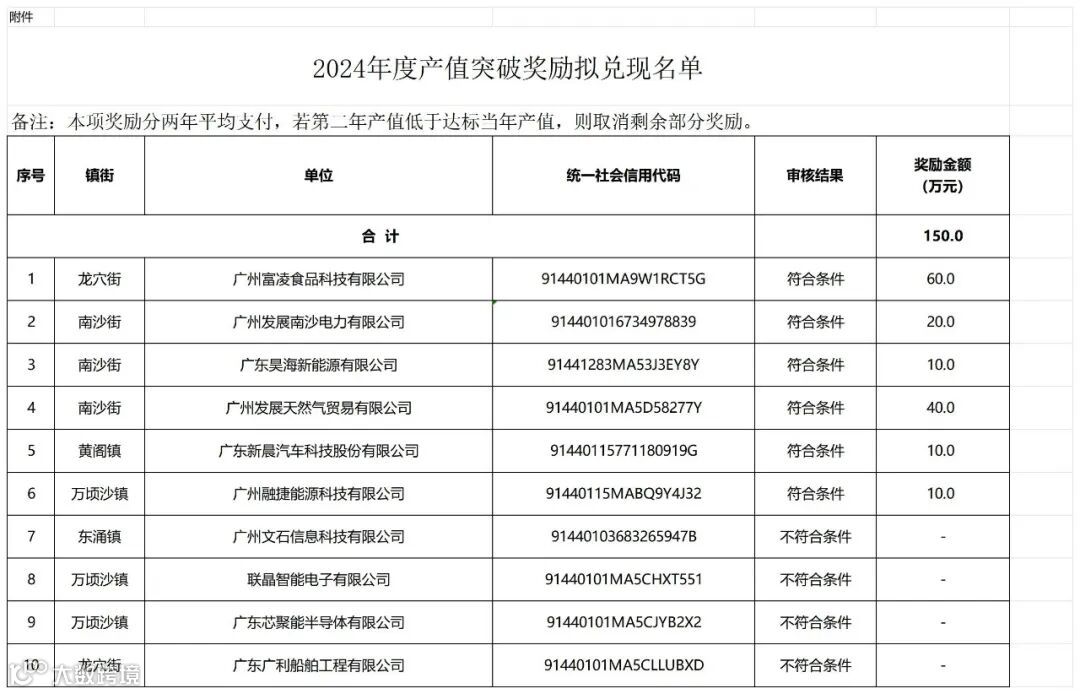 南沙新区(自贸片区)促进制造业高质量发展十条措施》(穗南开工信规字〔2023〕1号)有关规定,经企业申报、镇街推荐、部门核查、评审小组审定等程序,现对2024年度产值突破奖拟兑现名单予以公示,公示期为12月9日—12月15日(5个工作日)。
