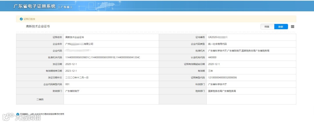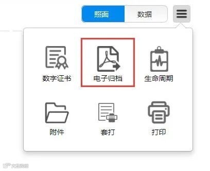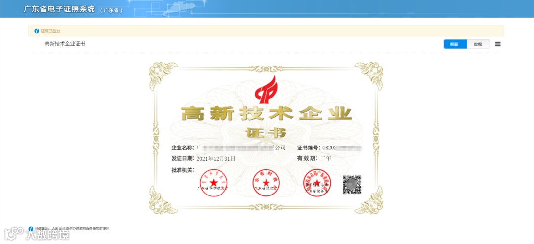 弹出电子证书,右上角可选择【照面】和【数据】查看
