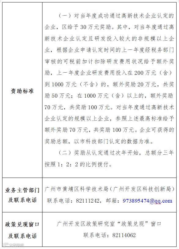 (一)黄埔区高企认定通过奖励资金由我区财政全额承担,采取分三年按照奖励总额1:2:2的比例拨付。