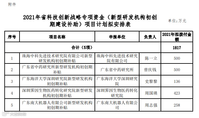 【资金安排】2021年省科技创新战略专项资金(新型研发机构初创期建设补助)拟安排资金