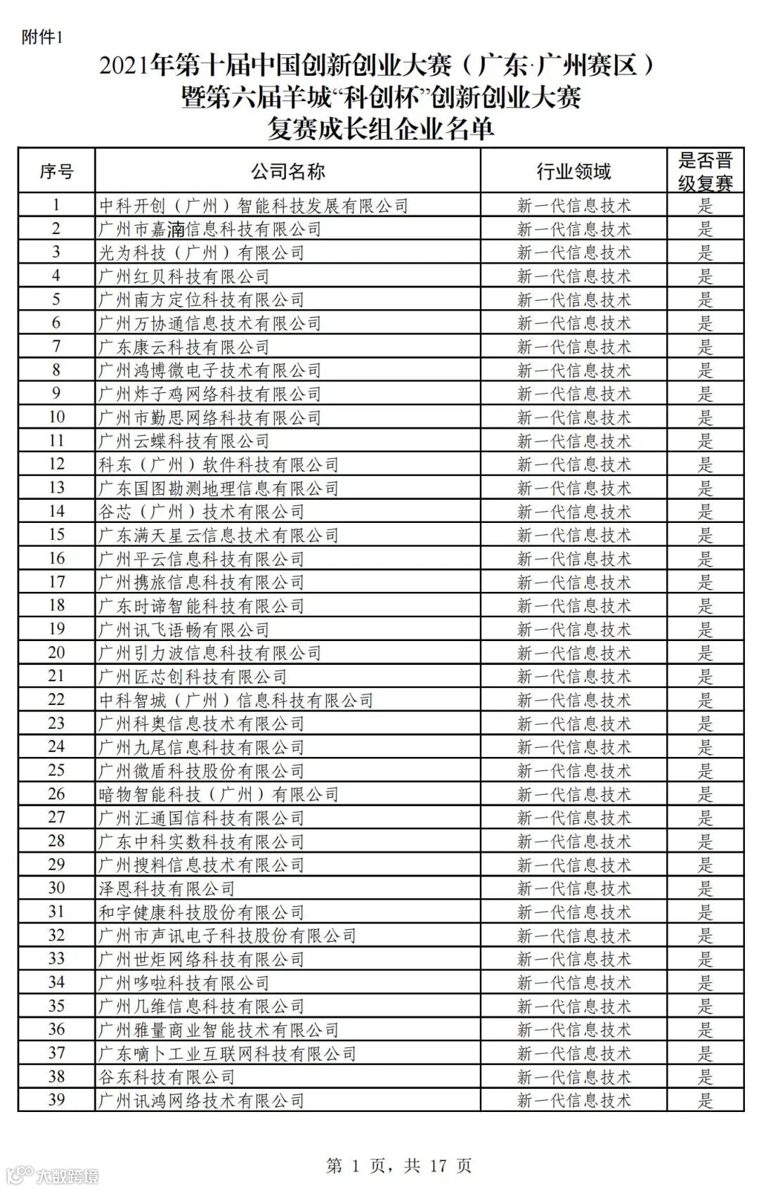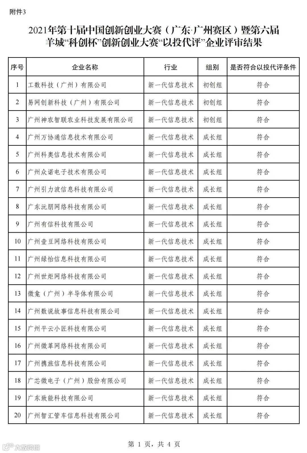 2021年第十届中国创新创业大赛(广东·广州赛区)暨第六届羊城“科创杯”创新创业大赛晋级复赛企业名单及“以投代评”企业评审结果公开