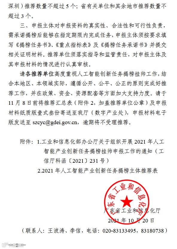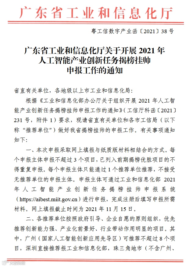 1.粤工信数字产业函[2021]38号:广东省工业和信息化厅关于开展2021年人工智能产业创新任务揭榜挂帅申报工作的通知.pdf