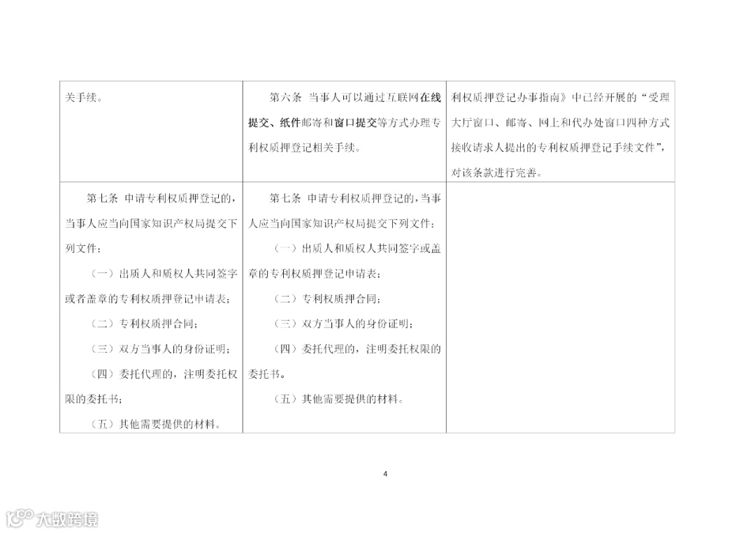 (四)优化登记服务,丰富登记事项。一是拓展办理渠道,明确当事人可以以互联网在线方式办理,为申请人提供便利(第六条)。二是明确规定专利权质押登记材料的查阅或复制程序及要求,方便当事人查询相关文件(第十六条)。三是及时为当事人提供更多预警信息。对于专利权质押期间,国家知识产权局应该及时通知质权人的情形,新增专利权属发生纠纷或被采取保全措施的情况,及时将新出现的专利权可能丧失的预警信息告知质权人(第十九条)。