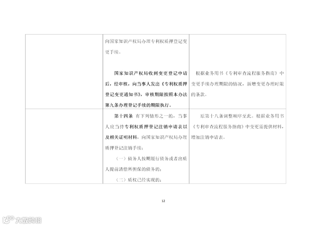 (三)压缩审查期限,提高审查效率。一是压缩审查期限,办理专利权质押登记手续的审查期限由原规定的7个工作日缩减至5个工作日,网上申请审查期限进一步缩减至2个工作日(第十条)。二是明确了办理专利权质押登记变更手续和注销手续需要提交的证明材料及相应的审查期限(第十三条、第十四条)。