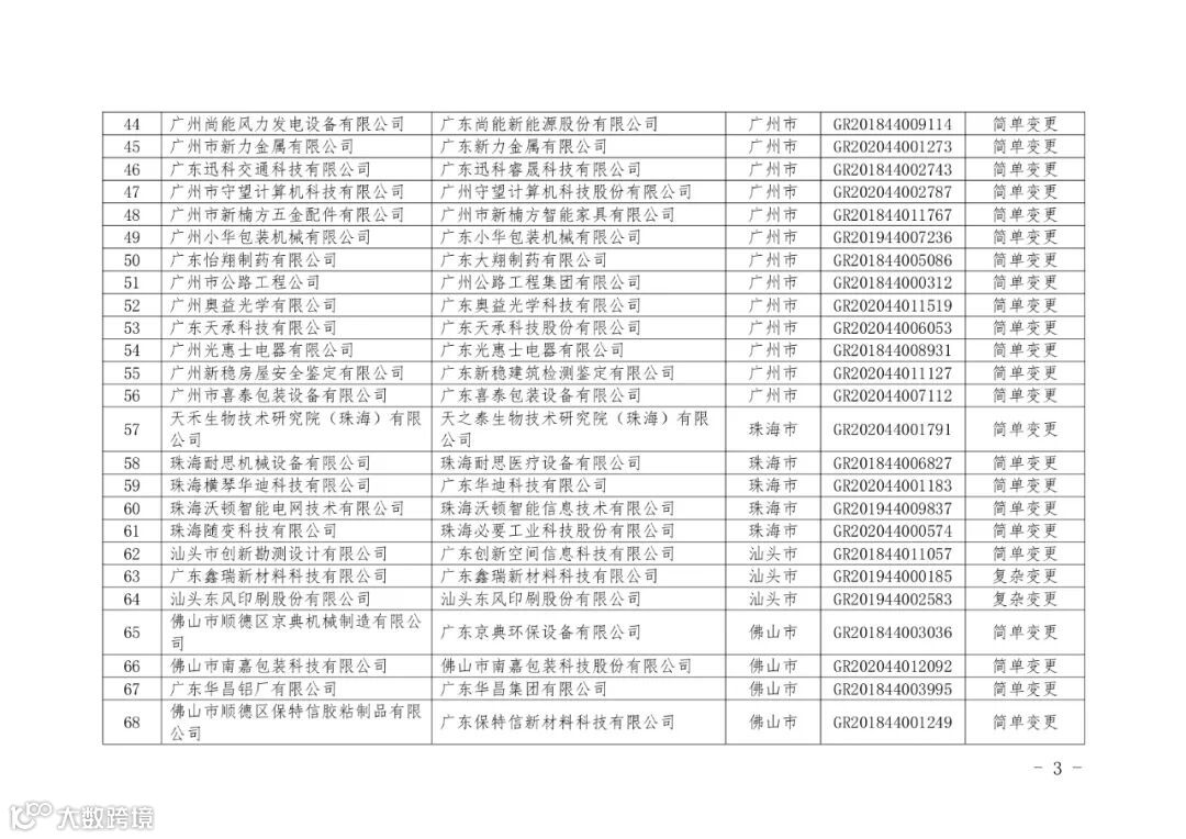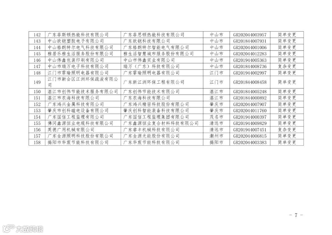 根据《科技部 财政部 国家税务总局关于修订印发〈高新技术企业认定管理办法〉的通知》(国科发火〔2016〕32号)和《科技部 财政部 国家税务总局关于修订印发〈高新技术企业认定管理工作指引〉的通知》(国科发火〔2016〕195号)的有关要求,经企业申请、专家评审和公示,广东省水利电力勘测设计研究院有限公司等158家企业发生变更后仍符合高新技术企业认定条件,现予以公告。