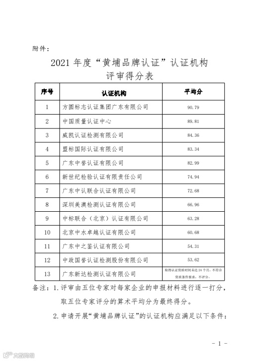 近期,广州市黄埔区市场监督管理局委托第三方对方圆标志认证集团广东有限公司等13家认证机构进行“黄埔品牌认证”认证机构评审,现将专家评审得分结果进行公示。