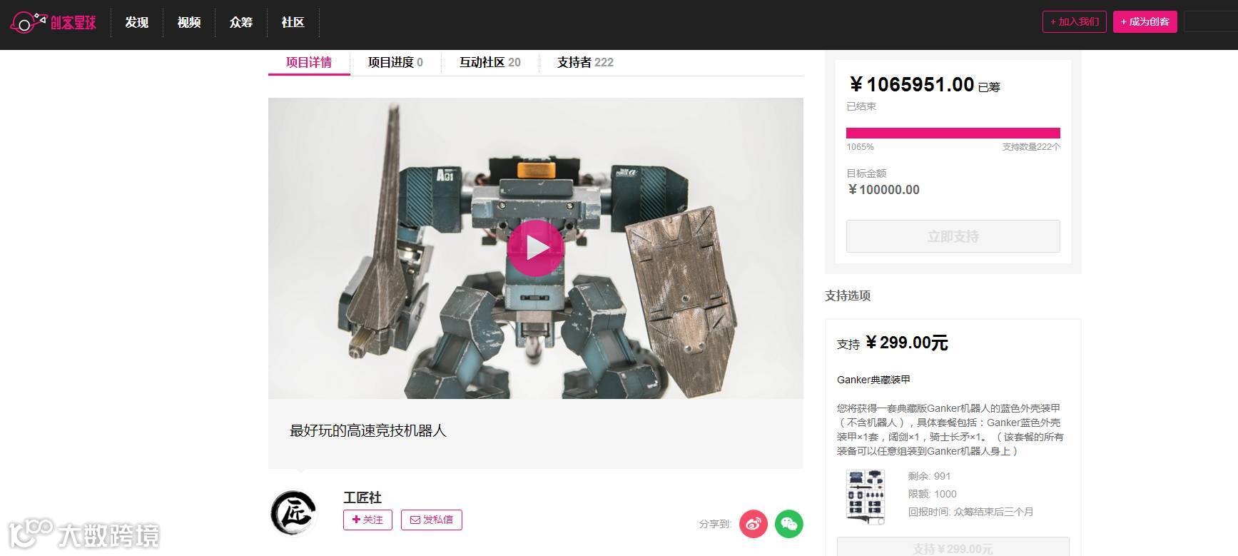 10月30日,由工匠社研发的首款高速竞技机器人Ganker在国内最具影响力的众筹平台之一——创客星球的产品众筹圆满结束。主打“男人就要开高达战斗”概念的Ganker格斗机器人在短短一个月内创下了百万级众筹记录,创造了格斗机器人新的历史!