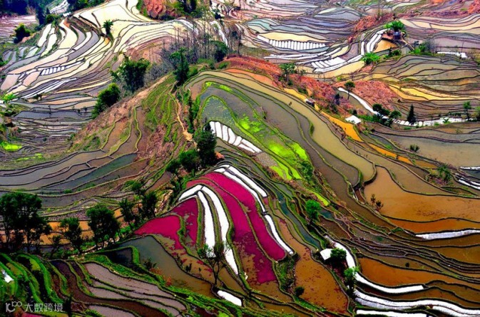空中拍摄彩色稻田。摄影师:Thierry Bornier