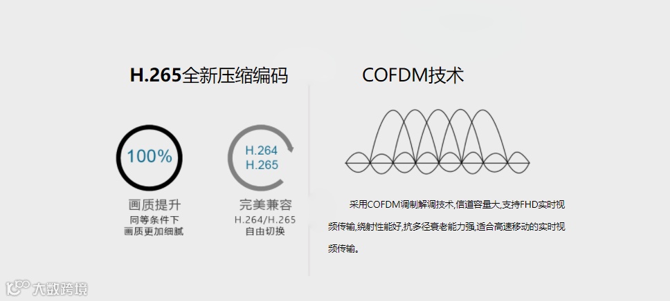 S2采用H.265全新压缩编码技术,同时采用COFDM调制解调技术,信道容量大,支持FHD实时视频传输,绕射性能好,抗多径衰老能力强,适合高速移动的实时视频传输。