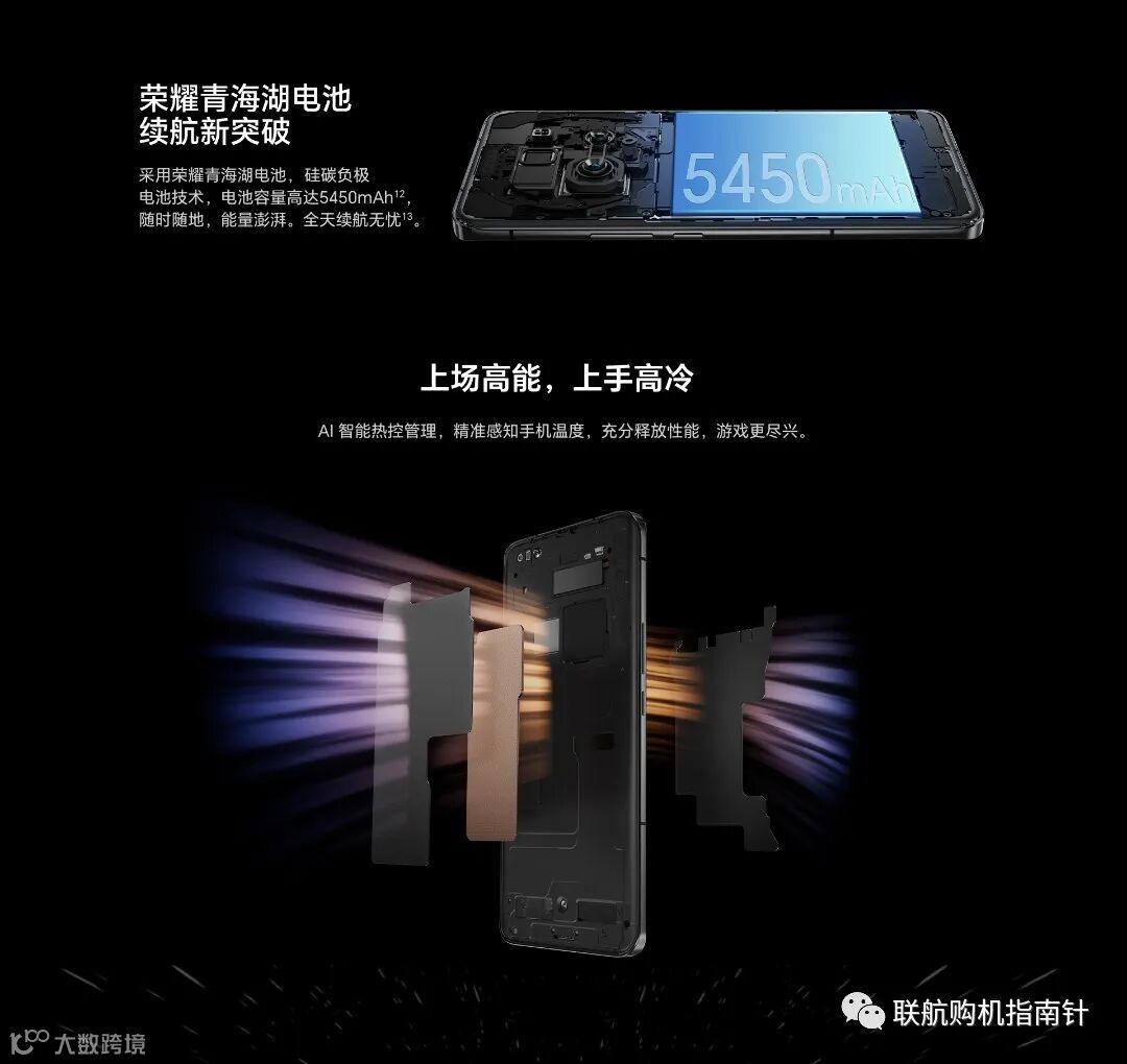 5450mAh电池是旗舰机里最大的,使用最新材料的青海湖电池,搭配荣耀自研节电技术,续航是普通旗舰机两倍,早上六点出门,晚上12点回家依然有电,做到真正续航一整天。