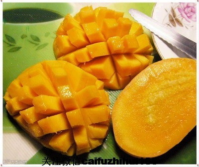 提醒: 芒果的汁液有一种成分,对皮肤不好,所以吃时最好切成一小块一小块的,不要碰到皮肤和嘴唇,这样就好了。