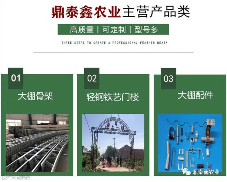 陕西鼎泰鑫农业科技发展有限公司主要生产各种类型温室大棚骨架、大棚配件,各种大棚资材、大棚配件的加工可根据客户需求定制、建设、零售、批发。为您提供一站式服务,公司生产设备齐全,定制、加工、轻钢铁艺门头、门楼、标示牌;可对外代加工钢材。