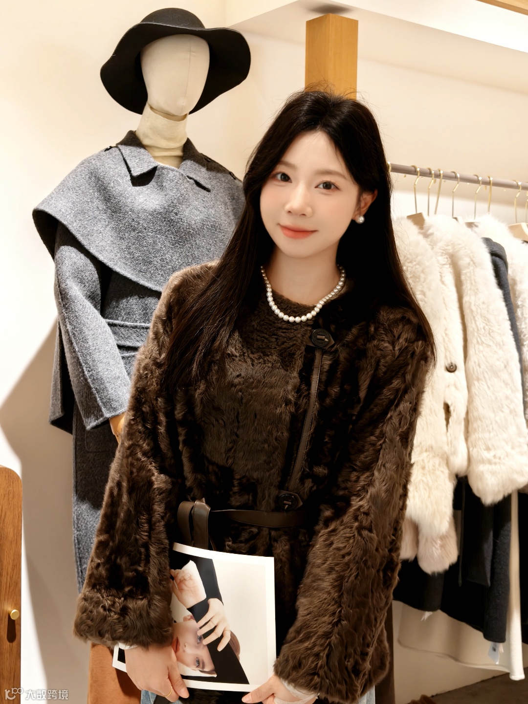 这件深棕色小湖羊外套质感绝了!毛绒细腻且富有肌理感,搭配同色系皮质腰带和珍珠项链,复古优雅又显贵气。