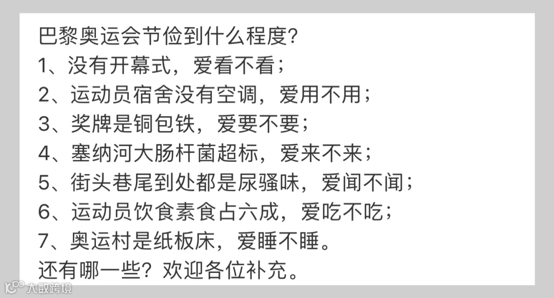 为了打造史上最环保的奥运会,法国人多少有些不管别人死活的意思。奥运村不安装空调、纸板床、渔网床垫、食堂几乎为素食...