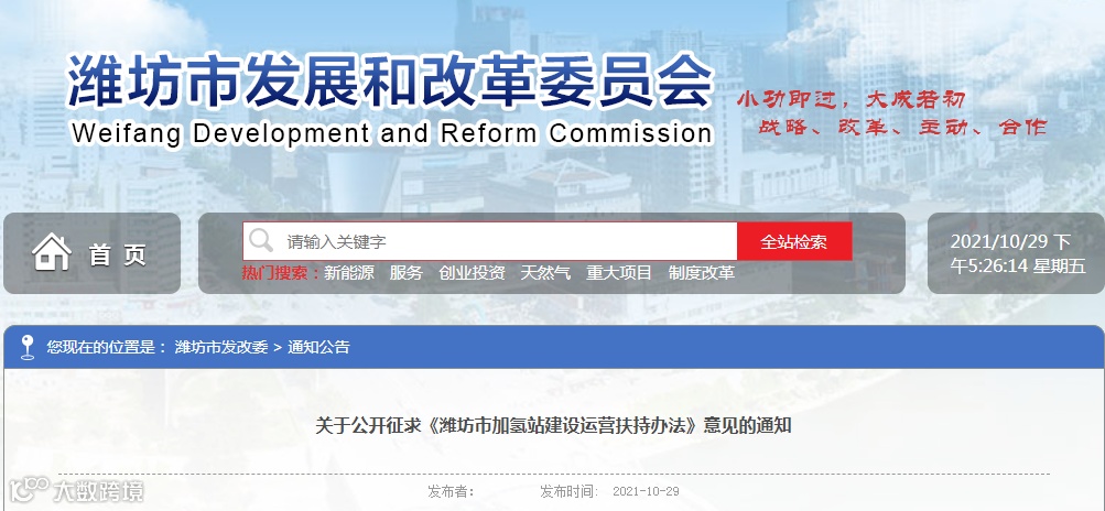 10月29日,潍坊市发展和改革发布关于公开征求《潍坊市加氢站建设运营扶持办法》意见的通知。