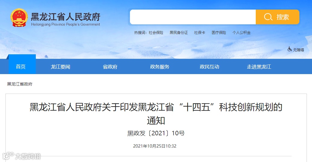 10月25日,黑龙江人民政府印发了《黑龙江省“十四五”科技创新规划》。