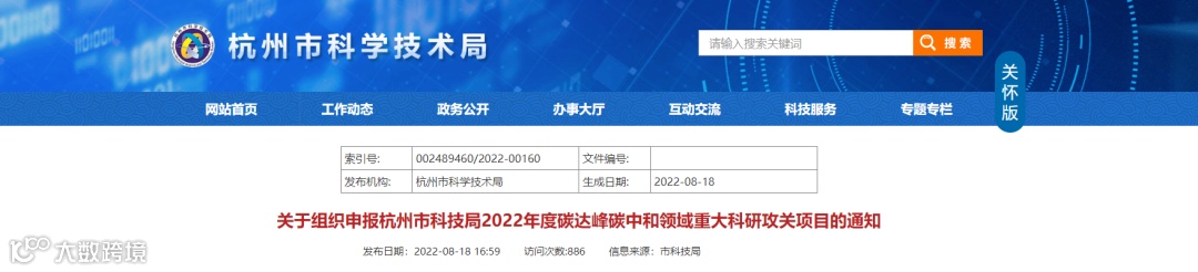 8月18日,杭州市科技局发文,组织申报杭州市科技局2022年度碳达峰碳中和领域重大科研攻关项目。