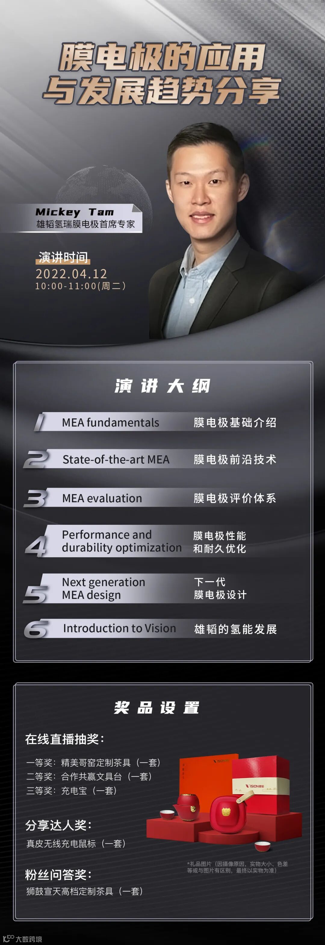 2022年4月12日10:00-11:00,雄韬氢瑞膜电极首席专家Mickey Tam将带来“膜电极的应用与发展趋势分享”的直播授课。本次直播有精美礼品相送!