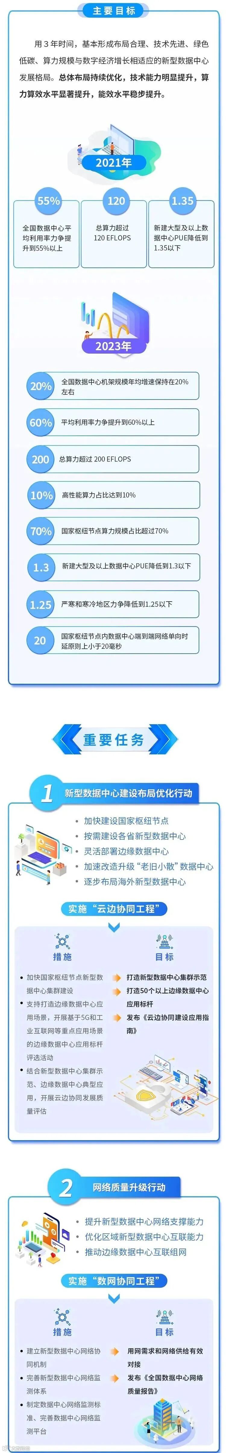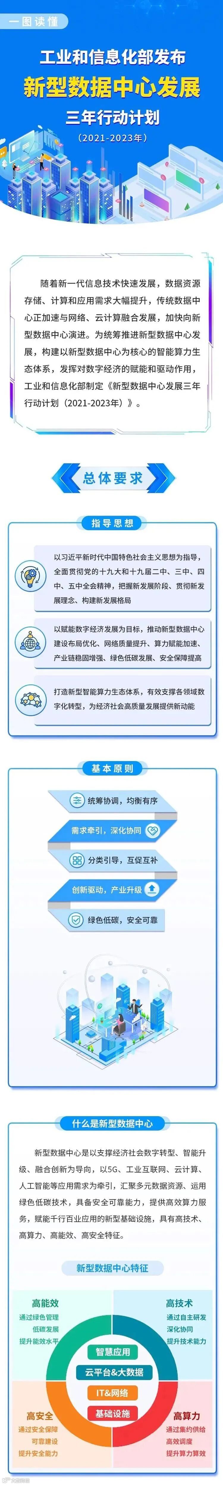 近日,工信部印发了《新型数据中心发展三年行动计划(2021-2023 年)》。该计划指出,要用3年时间,基本形成布局合理、技术先进、绿色低碳、算力规模与数字经济增长相适应的新型数据中心发展格局。《行动计划》表示,到 2023 年底,全国数据中心机架规模年均增速保持在 20% 左右,总算力超过 200 EFLOPS,高性能算力占比达到 10%。