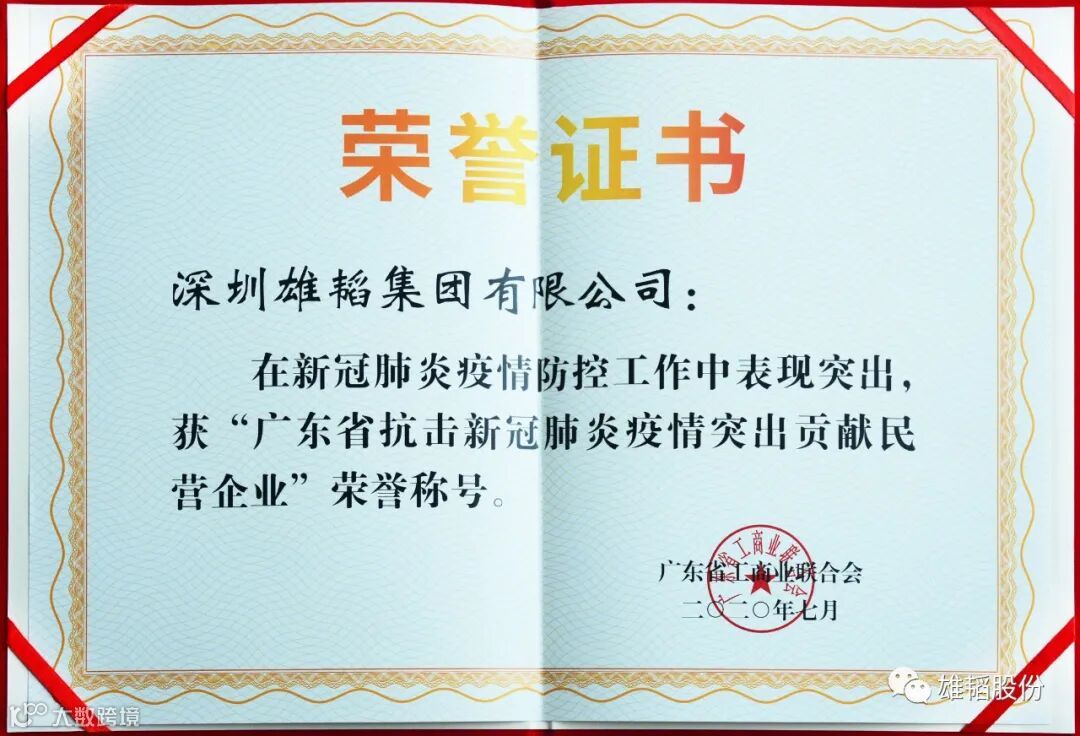 雄韬股份荣获“广东省抗击新冠肺炎疫情突出贡献民营企业”称号