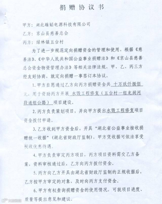 村委会无力支付此款项,村委会刘书记为了筹备修路款,四处化缘。9月中旬,雄韬集团张总收到一条信息,信息内说明了村委会面临困难和急需部分修路资金。张总得知后立即指示湖北雄韬同仁实地查看情况,在实地查看后,得知村委会经招标已与工程公司签订修建合同,合同以修建路基为主,总价10.98万元,先由建筑公司垫付修建,验收合格后付款。了解此状况后,雄韬立即伸出援手,制定捐赠方案。
