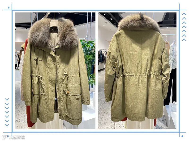 军绿色的派克服,可拆卸,两穿很实用,收腰设计,非常显瘦又气质!