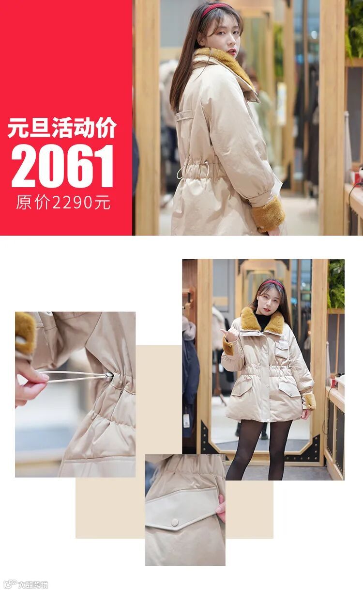 羽绒服和貂毛领制作的外套,冬天走在室外,领子一立,保暖又防风。腰部抽绳的设计,让人冬天也可以展现小蛮腰~它的包也hin大,包包上扣子的设计,十分安全~