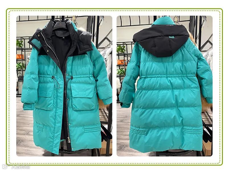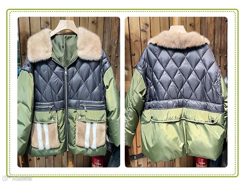 中长款拼接水貂毛领羽绒服,大口袋和拼接撞色设计特别吸睛,在冬季非常好穿搭!