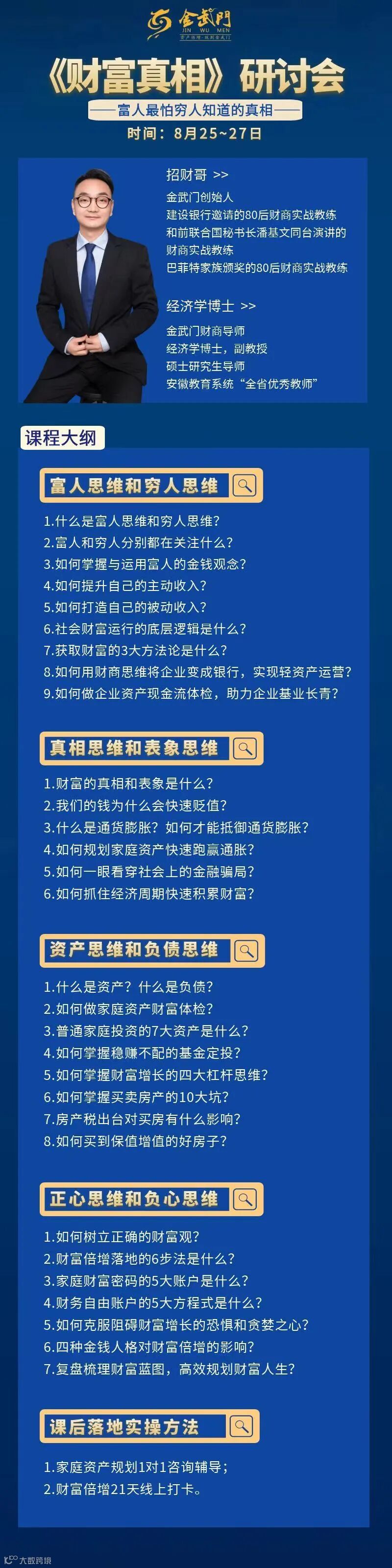 ——资产倍增落地引领者+华东区财商教育第一品牌~金武门集团,于7月21~7月23日合肥隆重召开第6期《财富真相》思维班,三天两夜,让您少奋斗十年!
