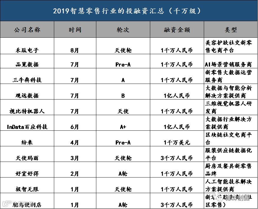 截止至2019年9月, 智慧零售行业主要投融资活动汇总如下(千万级):