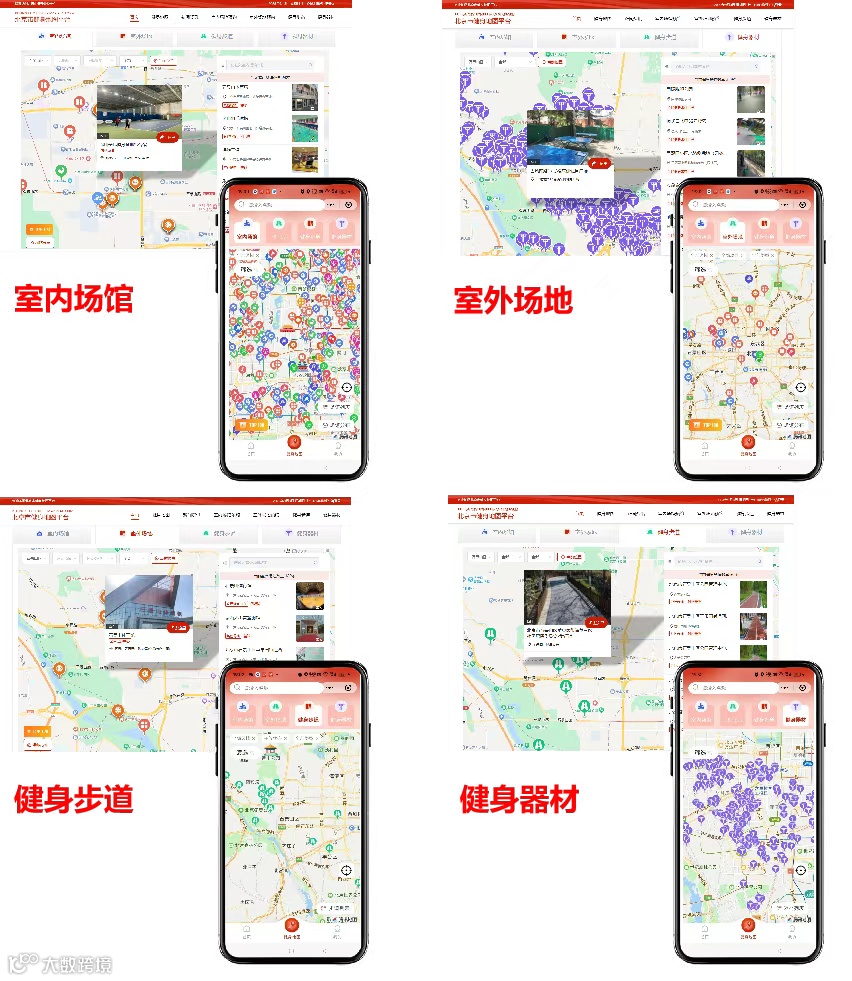 用户端体验全面升级:以“北京健身地图”为例,已基本覆盖北京市室内场馆、室外场地、健身步道、健身器材等相关群众健身场景,可通过动网、北京联通、京东多平台入口接入,已覆盖近1000万北京市民用户可直接访问平台,实现了“一张图、一张网、一中心、两门户、八系统”,起到智慧便民,赋能产业的作用。形成面向公众服务、场馆管理、政府监管的三维立体服务模式,打造北京市体育场地设施的一网统管、一图可查、一键预,有效破解 “健身去哪儿” 难题,还配合 “8.8 北京体育消费节” 推出特色专区,推动京津冀全民健身协同发展。