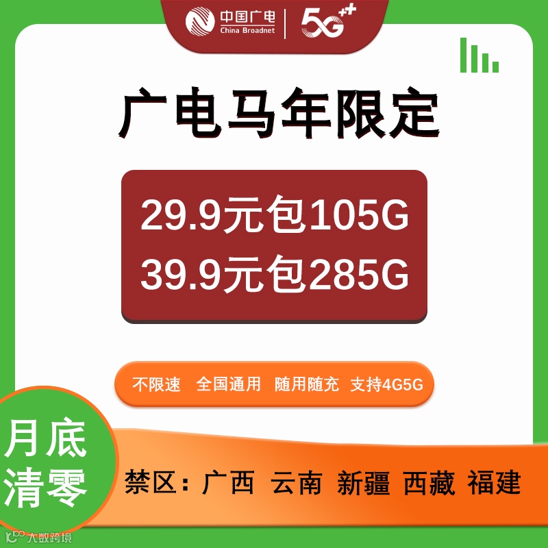广电马年限定套餐,支持4G/5G,不限速,全国通用流量,随用随充。