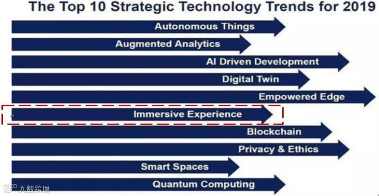 沉浸式体验是指通过技术手段完成模糊物理世界与数字或模拟世界之间的界限,从而营造出具有沉浸感的体验过程,是Gardner发布的2019年十大战略性技术趋势之一。