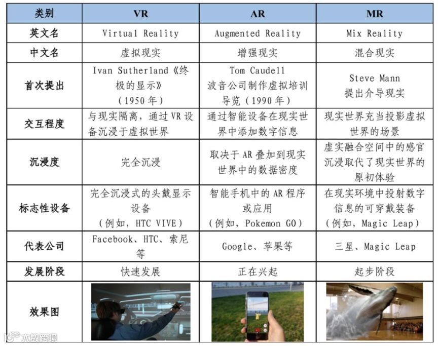 目前,扩展现实包括虚拟现实(VR)、增强现实(AR)和混合现实(MR)在内的三种类型,其区别主要如下: