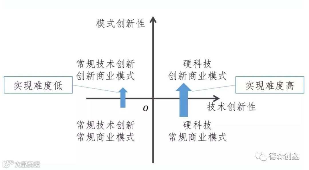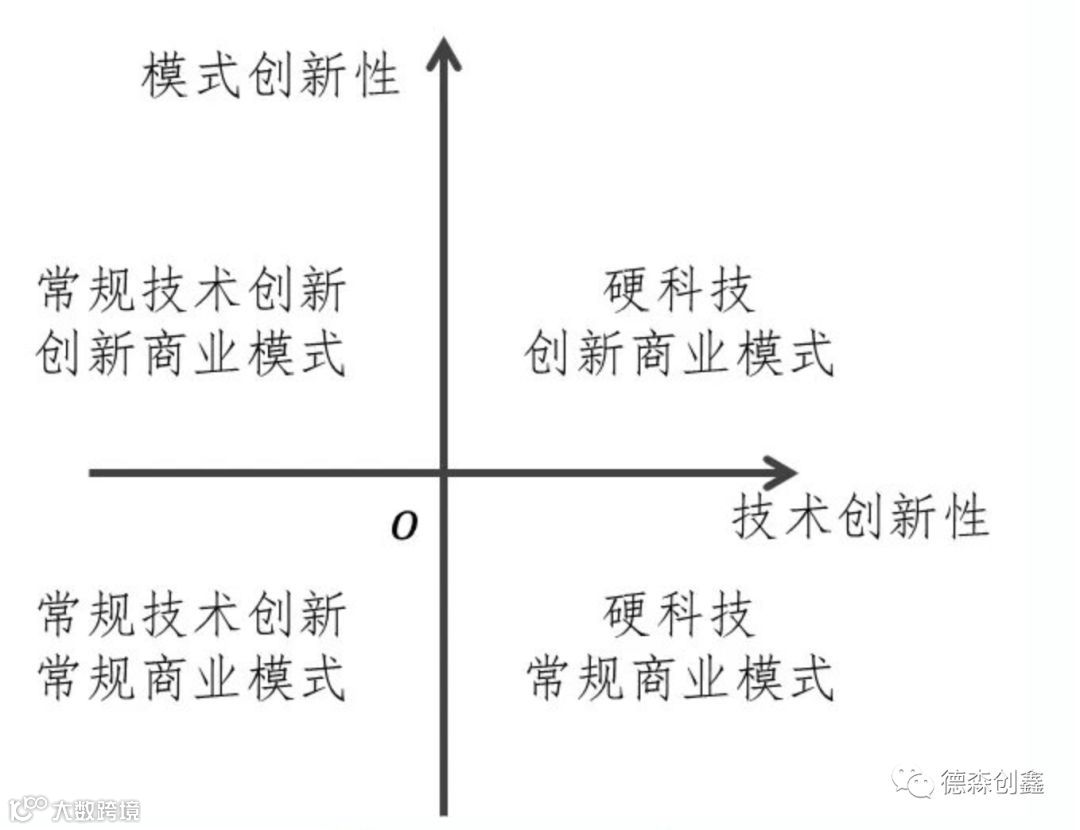 企业技术创新和商业模式创新可以归类为下图的四个不同象限,横轴代表技术创新的软硬程度,纵轴代表是渐进性商业模式创新还是颠覆性商业模式创新。上述的“更需要”就可以理解为:硬科技企业从第四象限转变到第一象限比常规技术创新企业从第三象限转化为第二象限更加重要。
