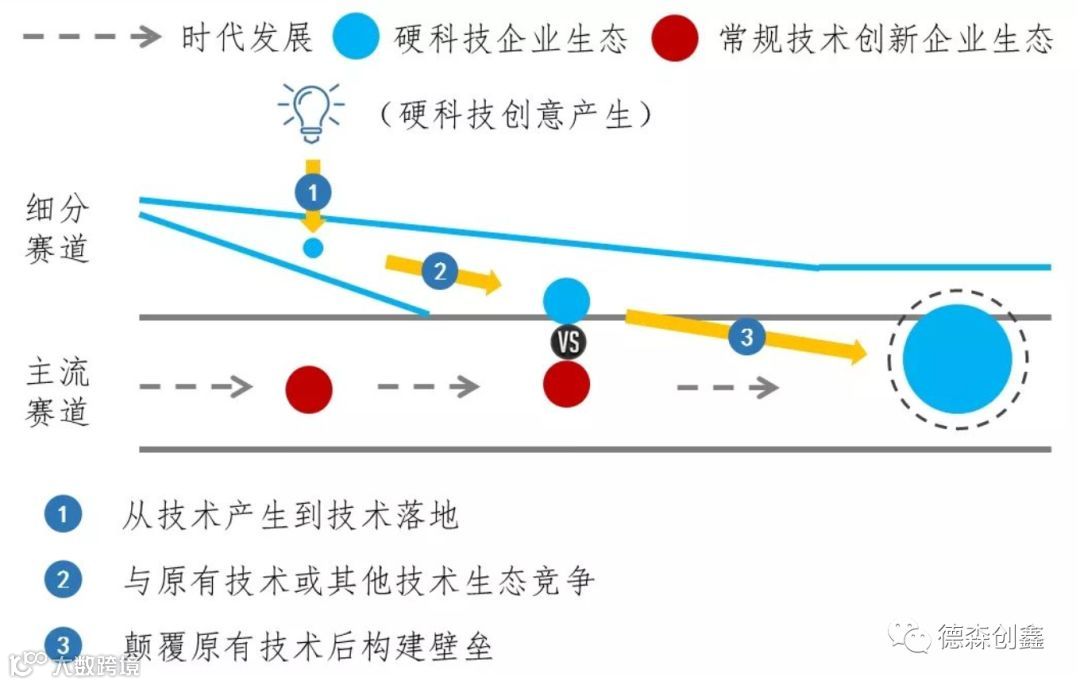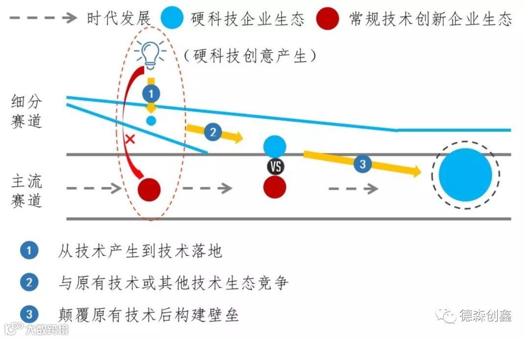 由于硬科技持续投入高和迭代速度快的特点,使得硬科技生态只有进入主流赛道,才能获得支撑其成熟的价值空间。在这一过程中,原有的生态系统通常对新生态系统持排斥态度,我们称此过程为对抗和颠覆的过程。 此过程往往会引发原有生态系统以及硬科技生态系统中旧利益相关者的退出和新利益相关者的加入,以及交易结构的转变。此时要求硬科技企业“有必要”从生态系统的维度进行商业模式创新。