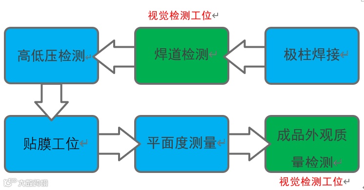 • 电池盖成品的检测,六面外观检测,包含焊道,防爆阀,注液孔,壳体正面等关键位置的质量检